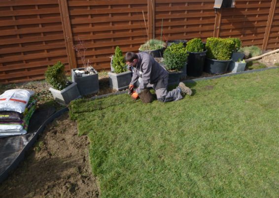 Plantation d’arbres palissés et implantation de notre première pelouse en rouleaux de l’année.
