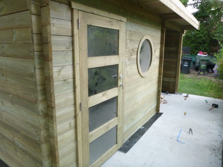 Installation d’un chalet de jardin XXL 7 x 4 mètres et 2.6 m de hauteur, coupé en deux pour un espace de détente et un espace de rangement.