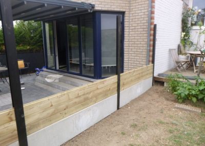 Remplacement d’une haie de conifère par une palissade composée de piquets de métalliques, soubassement de béton et planches traitées en autoclave.