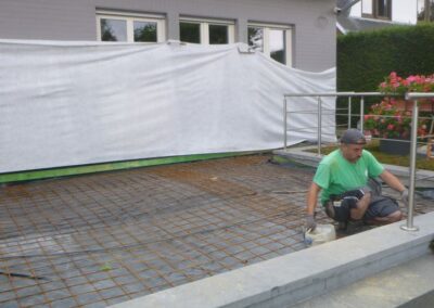 Rénovation d’une terrasse en bois suspendue par une nouvelle terrasse en grès-cérame 60 x120 cm posés sur chape de béton et ne demandant plus aucun entretien contrairement à l’ancienne terrasse en bois.